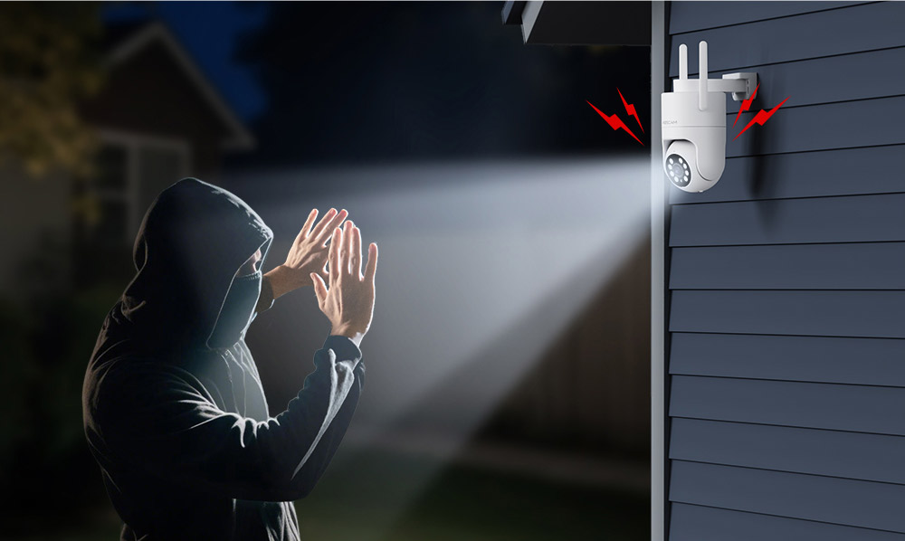 The camera features an active defense system that triggers sound and light alarms when suspicious motion is detected, effectively deterring unwanted visitors.