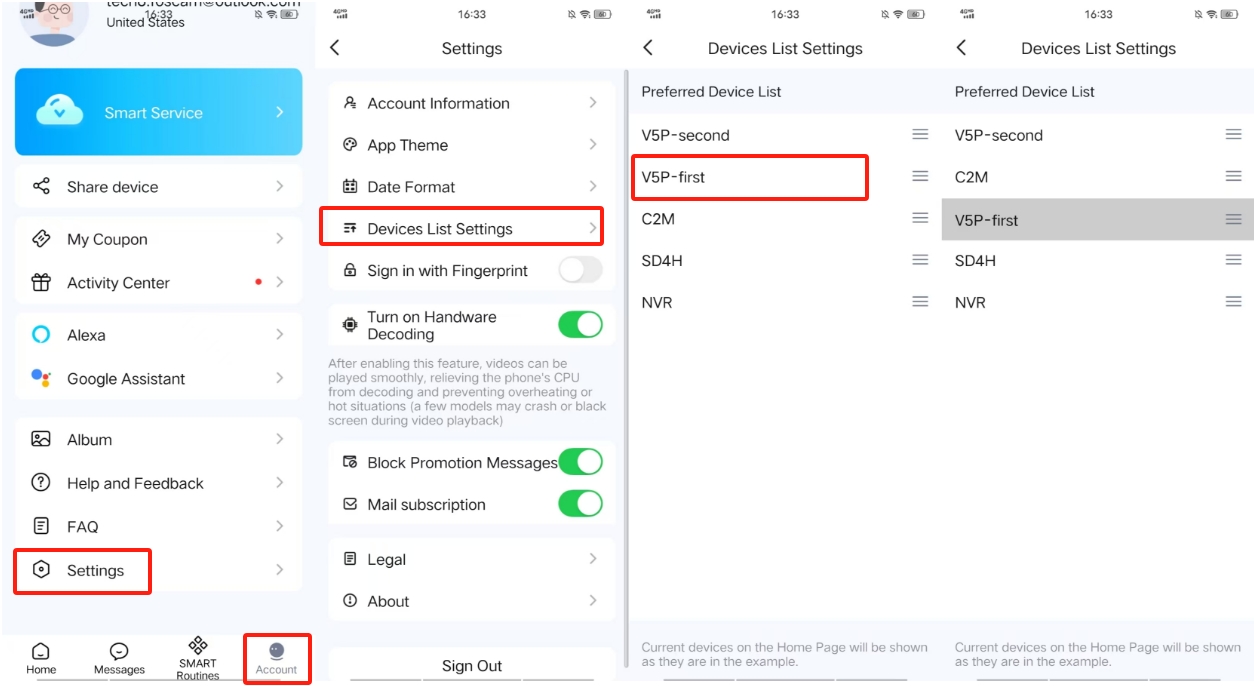 Ste1: Login Foscam app and tap on Account-->Settings--Devices List Settings.